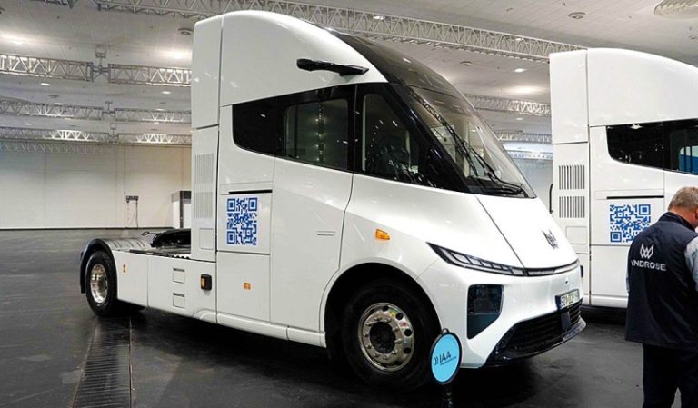 Дебютной моделью китайского старт-апа в Европе станет «зеленый» тягач WindRose R700 6х4. Одной из главных особенностей данной машины является отличная аэродинамика. Коэффициент ее лобового сопротивления достигает 0,2755Cd. Транспортное средство укомплектовано двумя ведущими мостами Hande Axle. В них инсталлированы электрические двигатели с пиковой отдачей 1400 л.с. Также модель оснащается аккумуляторами с суммарной емкостью 729 кВт/ч. Дальность хода достигает 670 км. Кабина грузовика отличается высоким комфортом. Внутри установлены амортизирующее водительское кресло с обогревом и вентиляцией, а также виртуальный щиток приборов. Стандартные наружные зеркала заменены на камеры. Стоимость модели составляет 250 000 долларов или 22,7 млн рублей. Автор: Павел Афанасьев
