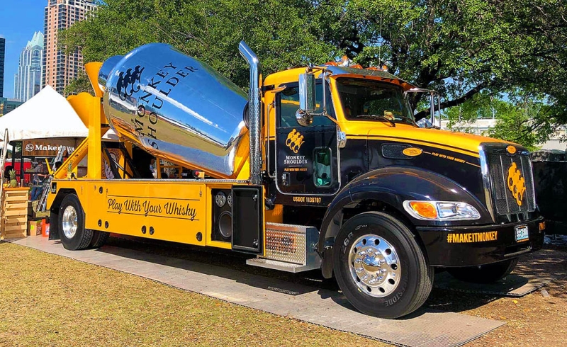 Шотландский производитель купажированного виски Monkey Shoulder представил оригинальный маркетинговый проект. Компания показала необычное транспортное средство, которое с виду выглядит как обычная бетономешалка. Однако на самом деле этот автомобиль представляет собой передвижной бар. Машина получила название Monkey Mixer и построена на базе шасси Peterbilt.